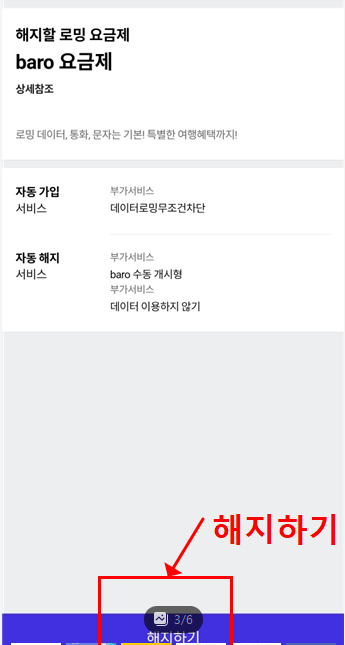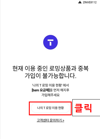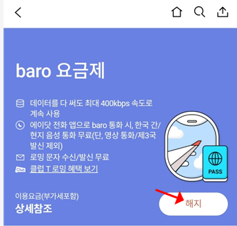 가입 불가능 안내가 나오면 "나의 T로밍 이용 현황" > baro 요금제 "해지" 클릭 > "해지하기" 클릭